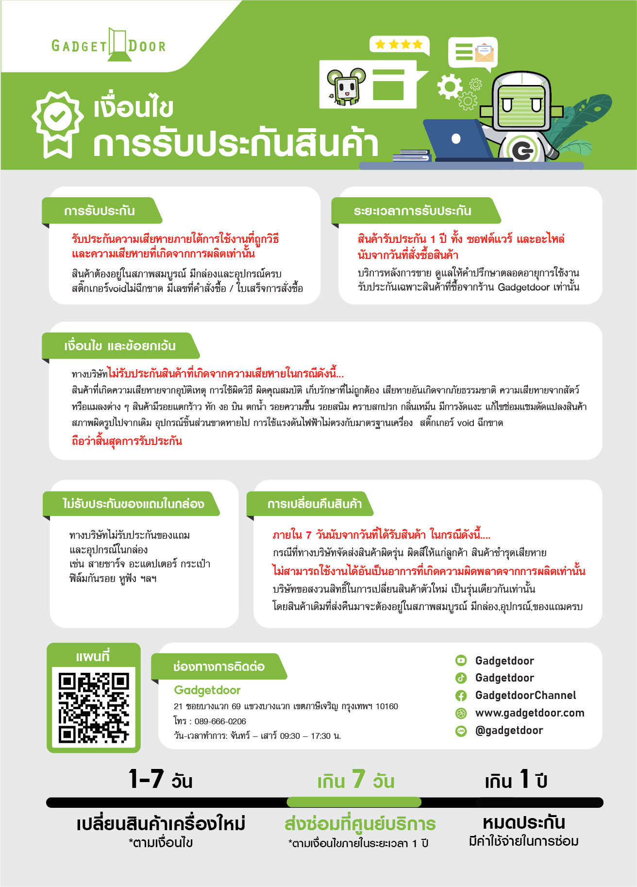 หมายเหตุ: รับประกันเฉพาะสินค้าที่ซื้อจาก Gadgetdoor เท่านั้น